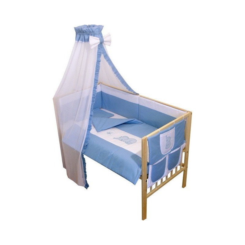 Lenjerie patut bebe brodat cu 7 piese albastru cu baldachin din voal
