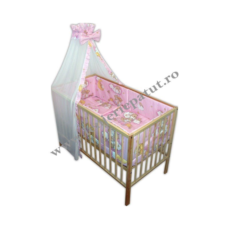- Lenjeria de patut cu sase piese contine si baldachinul, aceasta piesa protejaza pe bebelusul dvs. de razele soarelui atunci cand vrea sa doarma in timpul zilei, iar pe timp de noapte apara ochii bebelusului cand se aprinde lumina in camera, ocroteste copilasul de curentii de aer din incapere in timpul somnului si nu in ultimul rand ofera camerei si patutului o nota de eleganta.