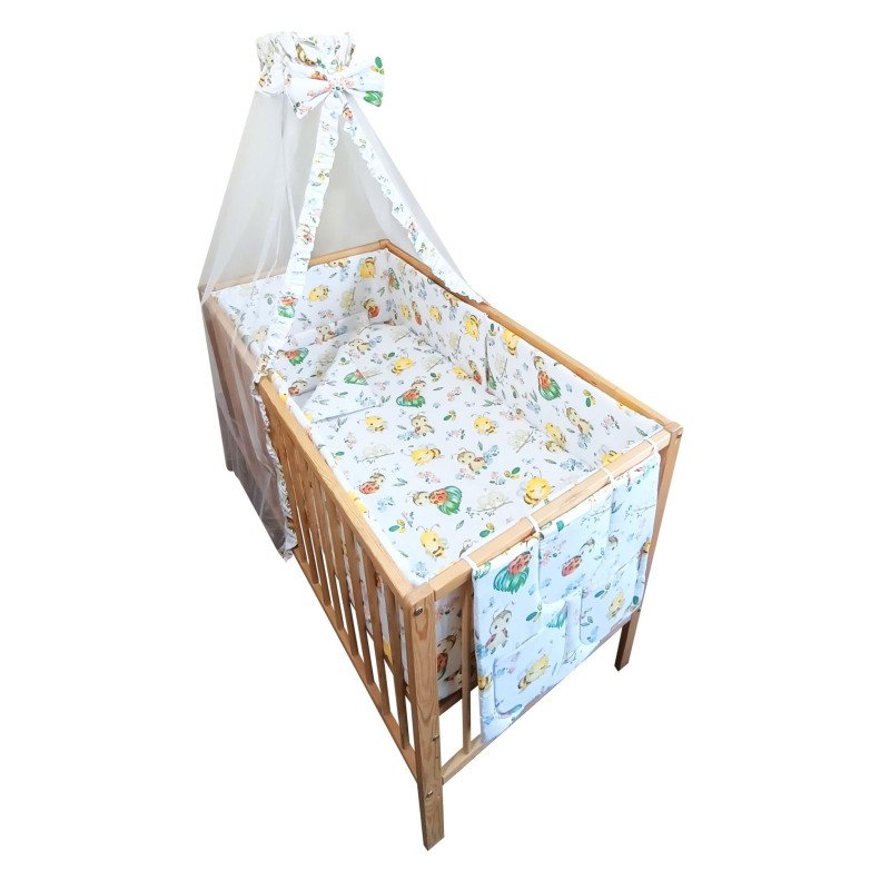 - Aceasta lenjerie patut include 2 aparatoare laterale pentru a proteja interiorul patutului in intregime, jur-imprejur pe ambele laterale, la cap si la picioare. Aceste piese sunt foarte importante pentru siguranta bebelusului, protejandu-l de lovituri sau accidente in timpul somnului sau in timpul jocului in patut. In acelasi timp, fereste copilul de curentii de aer din incapere in timpul somnului.