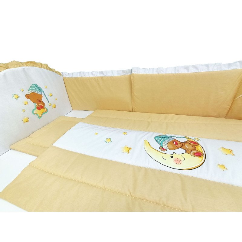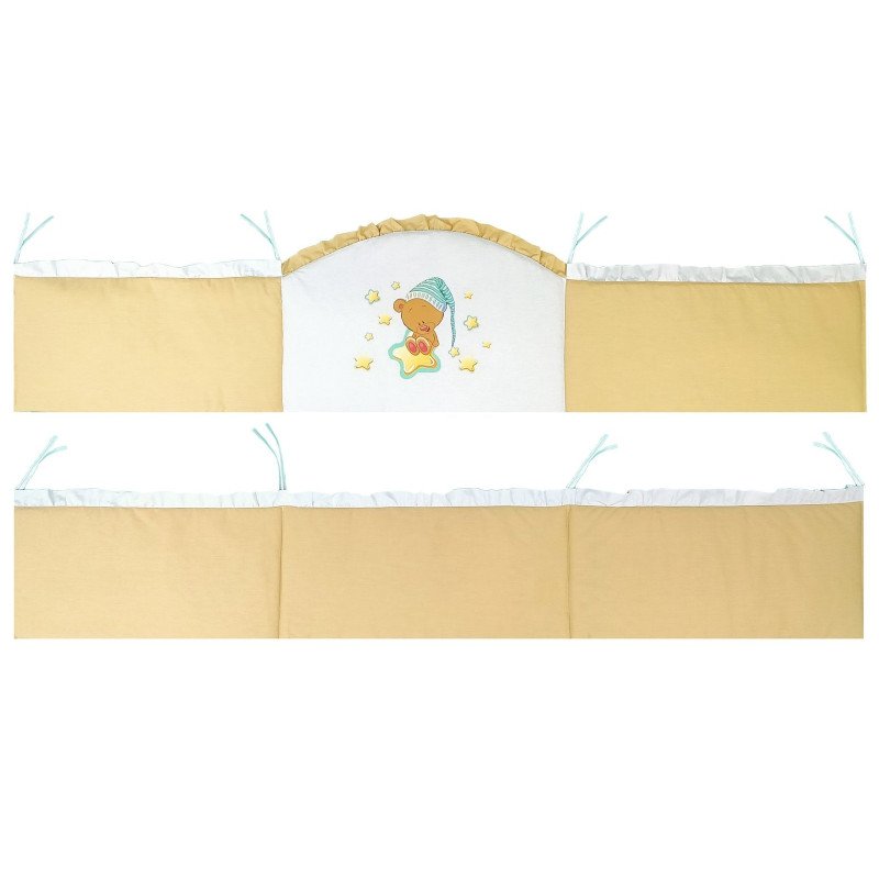 - Aceasta lenjerie patut include 2 aparatoare laterale pentru a proteja interiorul patutului in intregime, jur-imprejur pe ambele laterale, la cap si la picioare. Acest lucru este foarte important pentru siguranta bebelusului, pentru ca nu poate sa se loveasca in timpul somnului sau in timpul jocului in patut. Ocroteste copilasul de curentii de aer din incapere in timpul somnului.